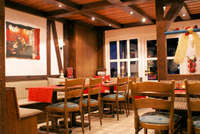 Das Hotel liegt an der Linkskurve, dort am besten geradeaus fahren und nach 20 m links auf den Hof.