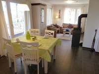 Der Wohnbereich verfügt über eine gemütliche Sitz- und Essecke mit Kaminofen, Fußbodenheizung, LCD-TV-Gerät, Ministerioanlage, CD- und DVD-Player, kleine Bücher- und DVD-Ecke sowie einen Ausgang zum großen Balkon mit Terrassenmöbeln.