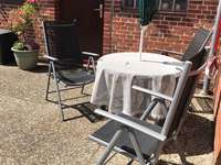 Die kleine Sonnenterrasse ist mit Gartenmöbeln und Grill zum Erholen bestens geeignet.